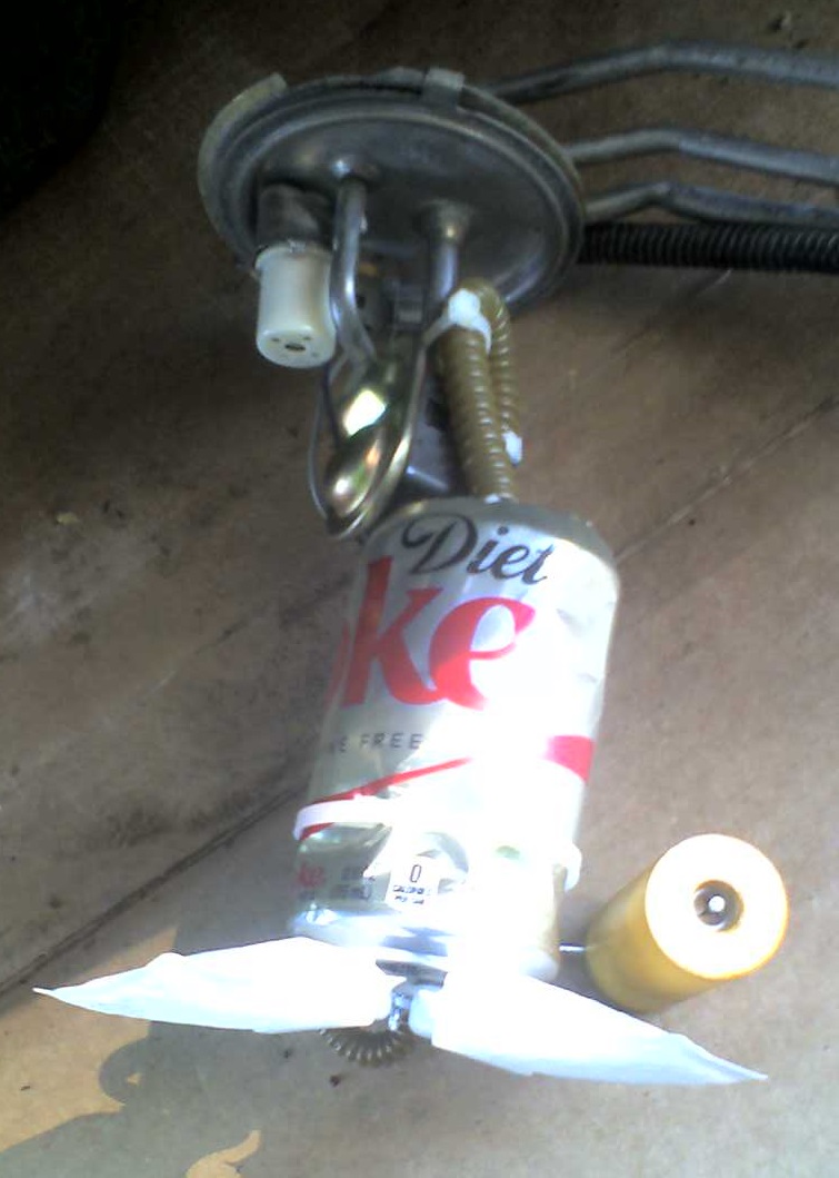 So, the car has been sitting (again) for a while. A few weeks ago, I pulled a pump from a newer Deville with the H.O. 4.6 Northstar. Higher operating pressure than the Berettas use (in the 50-60 range), and certainly able to power a bigger engine than mine, I don't think I will be over-taxing this thing. Oddly enough, this pump has two smaller inlet ports instead of the single big one. The '90 Berettas also do not use a bucket, so I had to make some modifications. I bought two small filters used for the Chrysler Sebring that fit beautifully, and cut-up a Coke can to make a bucket (of sorts) to keep the pump cool. I routed the return fuel line into the can to keep the supply of cool fuel fresh for the pump. It looks awful, but seems to work fine. The car runs good with it, 47 psi KOEO, 43 psi idle, 45 psi with some throttle put in. I still have to test drive it -the Indy project car is currently blocking it in- but the prognosis is good. And I am getting darn good at pulling that tank!