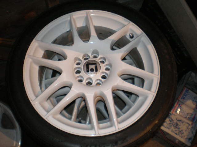 Also looking to sell my white Motegi MR12s. These are 17x7.5, 40mm offset. I had these on my black 94 Z26 for a couple years. Rims are in very good shape, but again the tires are crap. Asking $250