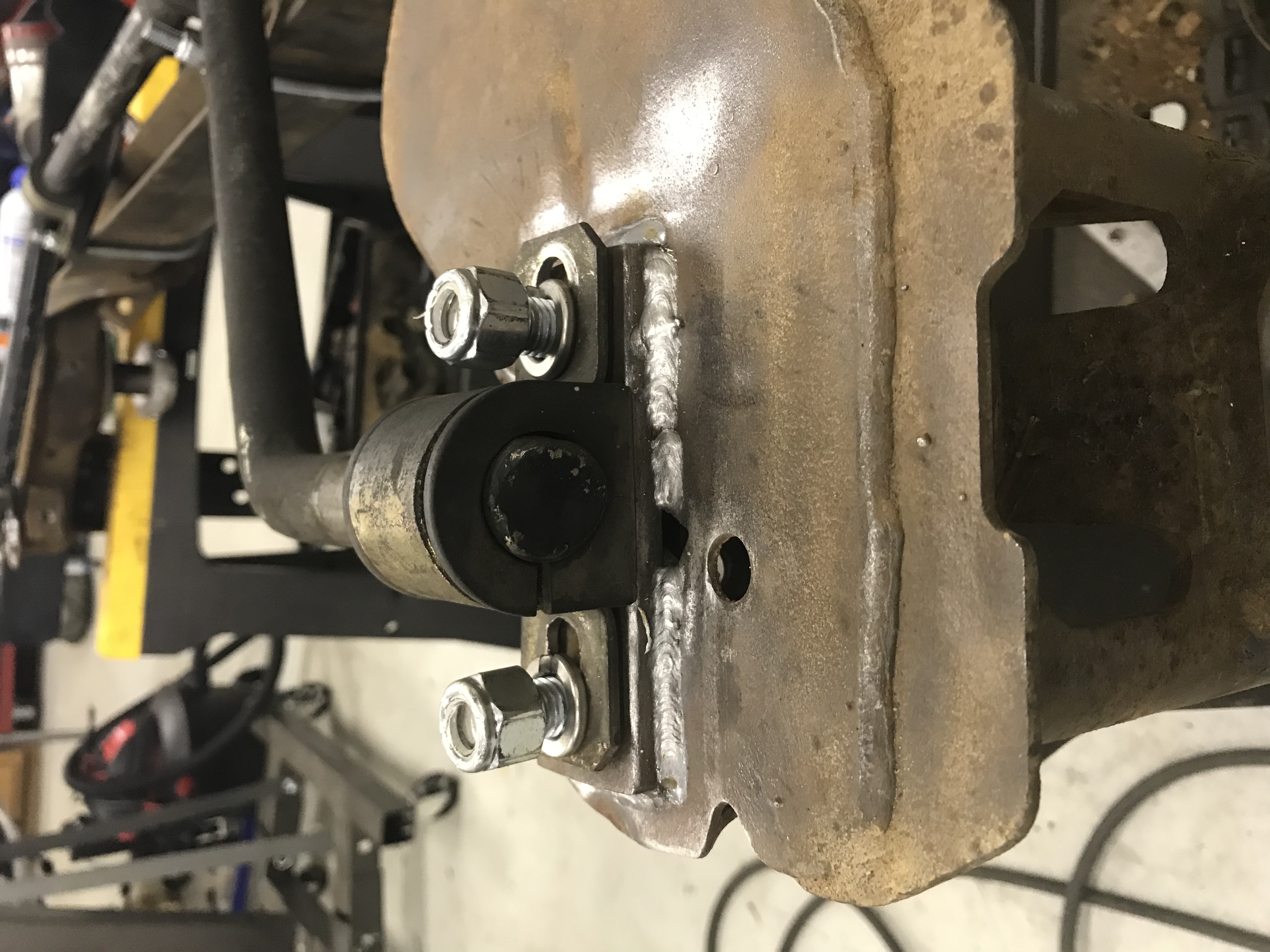 Shane and Brian really did most if not all the work on the axle. They stripped it down (I bought it loaded with everything on it still), cleaned it up some, got the bushings burned out and removed the steel from the bushing. Later, Brian positioned and welded in the Wolfe Racing adjustable coilover spring mounts, then we looked at how to mount the 26mm Addco bar to the axle. The "beam" section on the J-body axle is narrower than the L-body axle, so the Addco mounting hardware wouldn't swap over. A trip to Lowes solved that with some 3/8" all-thread for the center mounts over the beam. We reused, but modified, the Addco hardware from my old setup. For the ends of the bar, we again reused the old hardware, but tapped, threaded, and welded in studs for the bar to mount to. Then Brian welded them into place after careful measurement.