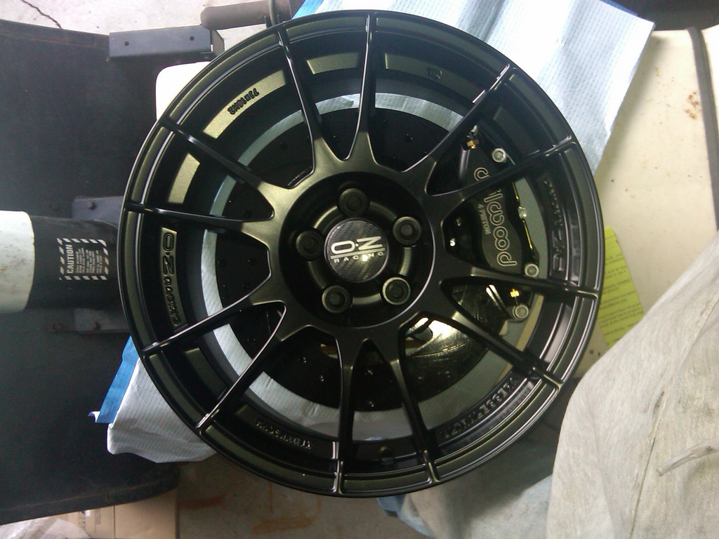 I know it's been a really long time but I figured I'd update a bit. After some test fitting, there is no way this kit will fit under the stock GTU or GTZ rims without some serious spacers. I decided that since I'm going all out on this car I'd just get the rims I really want and picked up a set of 16x7 OZ Ultraleggeras with a 35mm offset. These clear the 4 piston caliper by roughly 1mm! I really like the way they look.