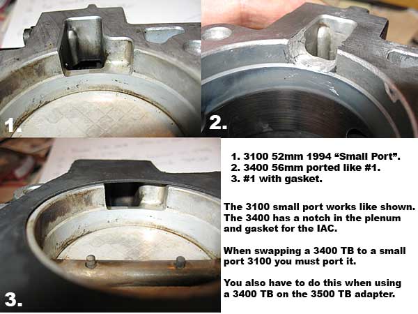 When swapping a 3400 TB (56mm) onto a small port 3100 you gotta mod it so the IAC passage gets air to the motor. (You will also need to port the plenum to take advantage of it, but better to upgrade the whole intakes).
