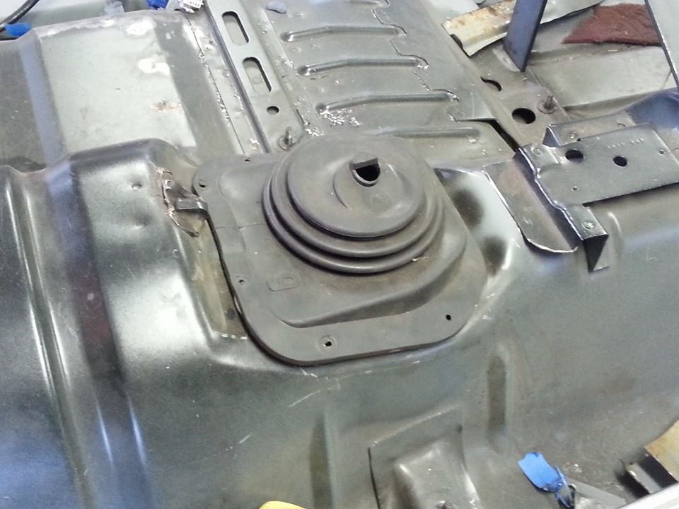 Installed the bronze pilot bushing, new flywheel, and zoom HP Kevlar clutch, and pressure plate. Also cut the hole for the 6 speed shifter and mocked up the shifter boot.