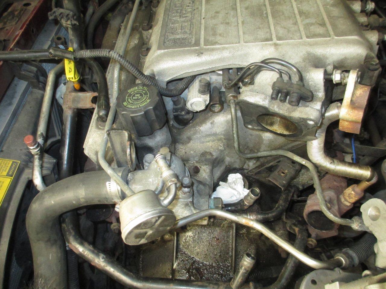 I kind of needed to get all of this out of the way to deal with the coolant hoses. The pic doesn't show, but I believe the one is a quick-connect o-ring fitting from the factory. Someone had ditched this and put a regular hose nipple in the thermostat housing. They just put a short piece of hose on (too short) and 2 clamps.