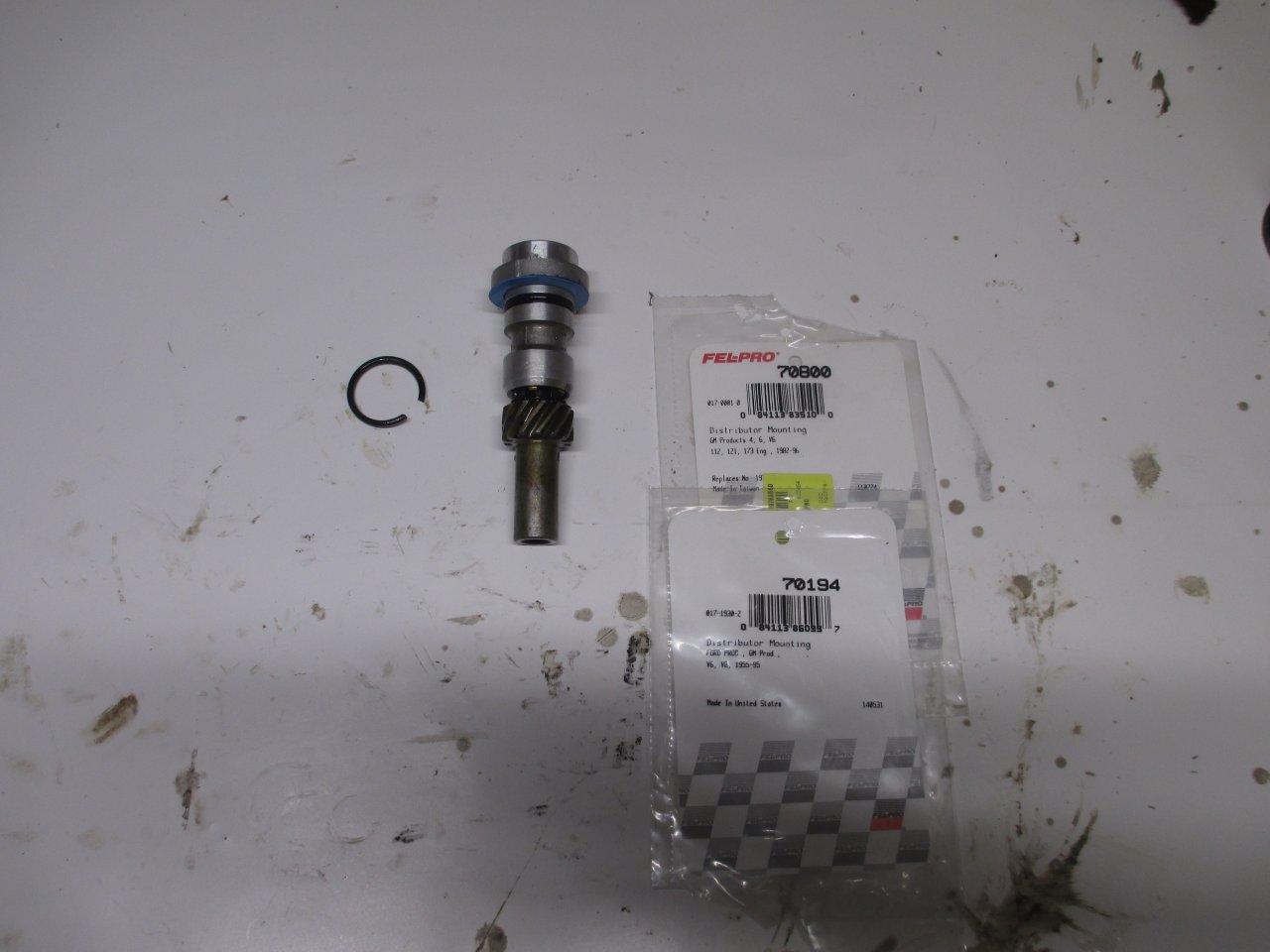 Here's the distributor dummy/oil pump drive and rthe felpro p/n's I used. Unfortunately the o-ring is the black kind so it may be short-lived. I did a search here and found the p/n for the small-block Chevy distributor base gasket and used it as well (thanks 3x00 Modified and Geoff).