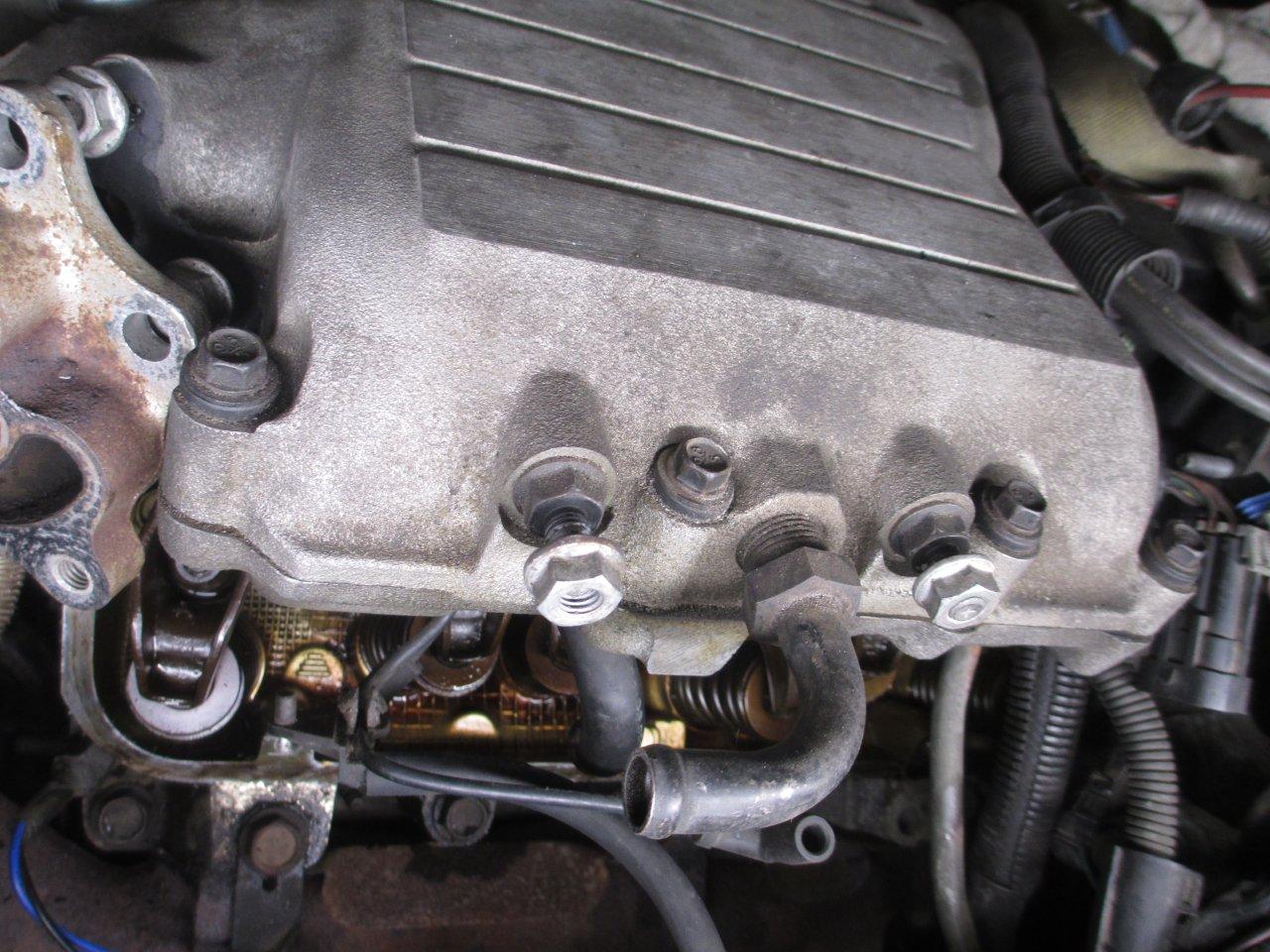 Luckily you can slide the valve cover out without moving the power steering lines or the alternator bracket, it just barely clears. Speaking of power steering lines, the return line looks to have experienced an interesting previous repair. Not sure though, maybe its original. Anyway, the engine looks nice and clean inside for 154k.