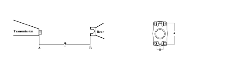 driveshaft will need to be 46 5/8 inches long from the face of the tans where the seal sits to the face or center line of the yoke. also it will need to be the same spline count on the output shaft and have the same yoke as a chevy 10 bolt rearend A= 3 1/2 inches and B =1 1/2 inches.