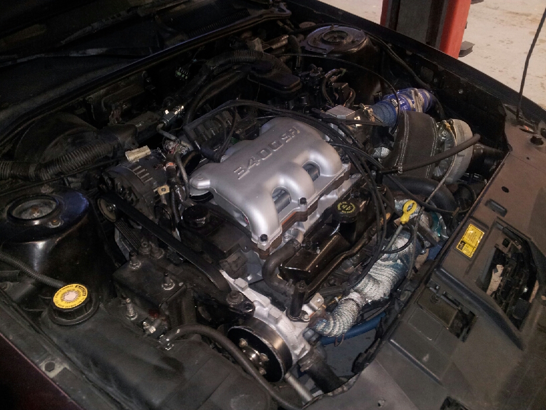 How the engine looked when I bought it in 08' How it looks now (I took this picture 12/18/12) There's probably more that I'm forgetting. I by-passed the heater core and drilled the t-stat to help prevent bubbles (Superdave had this issue). I used a 2005 equinox thermostat housing because it was straight and not curved. I also put in a 2001+ starter motor because it's a lot smaller. And of course I used 2 step colder spark plugs. I will update as I go along and feel free to ask lots of questions. Also heat wrapped everything and a turbo blanket. And after I rebuilt the trans I painted it industrial gray for Jon