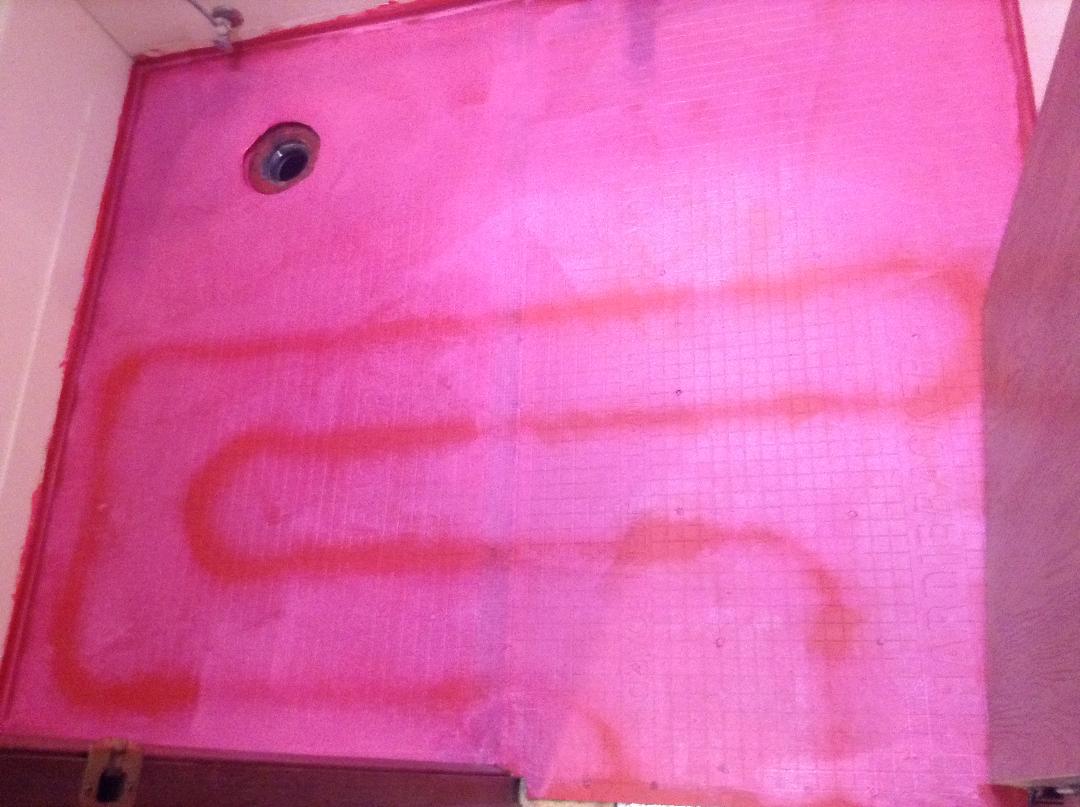 - I used Red Gard -this is a water PROOF membrane. 100% protection from water damage, and fantastic adhesion for thinset mortar. You can see where the heating pipes are, helping to dry the Red Gard.