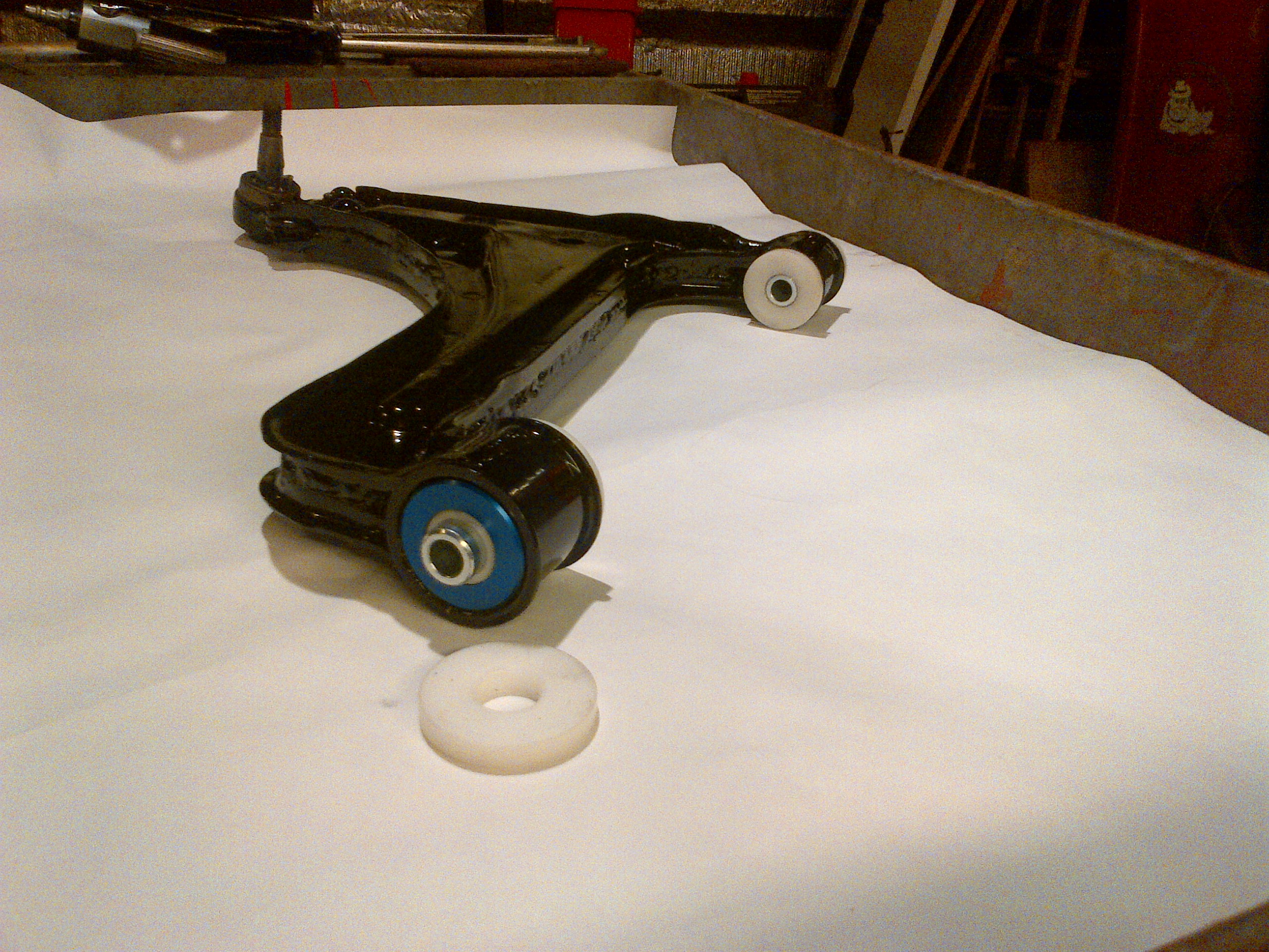 welded, blasted, and powdercoated control arms with greasable Del-A-Lum bushings installed