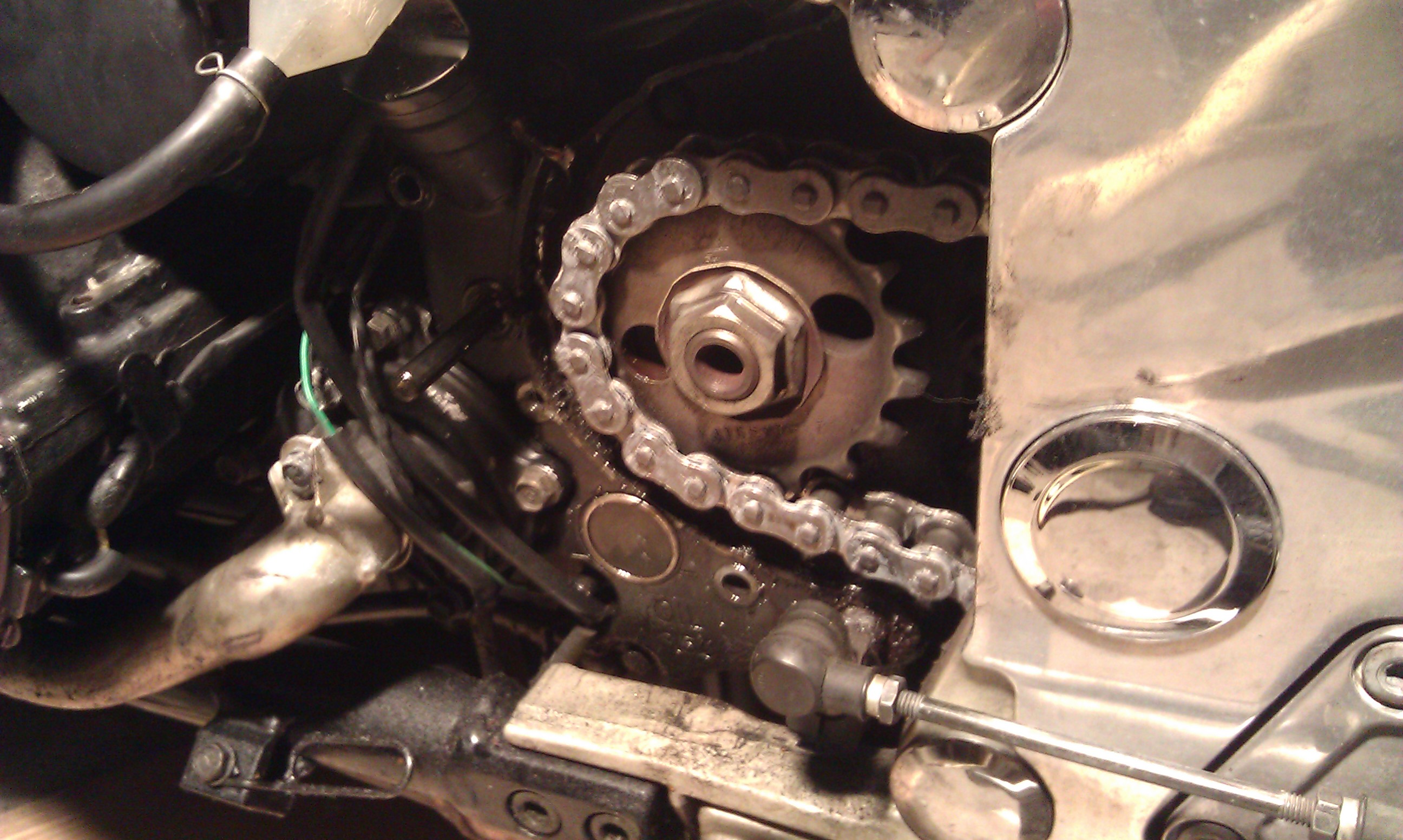 The engine did have to be unbolted from the frame to scoot it forward enough for the inner sprocket case to clear the side of the frame, which is where most of the time was spent. Aside from that, removing the lower fairing sides and applying the 450+ foot-pounds of torque it took to unbolt the front sprocket without tipping the 601-pound bike off of its' center-stand were the only real effort the repair took.