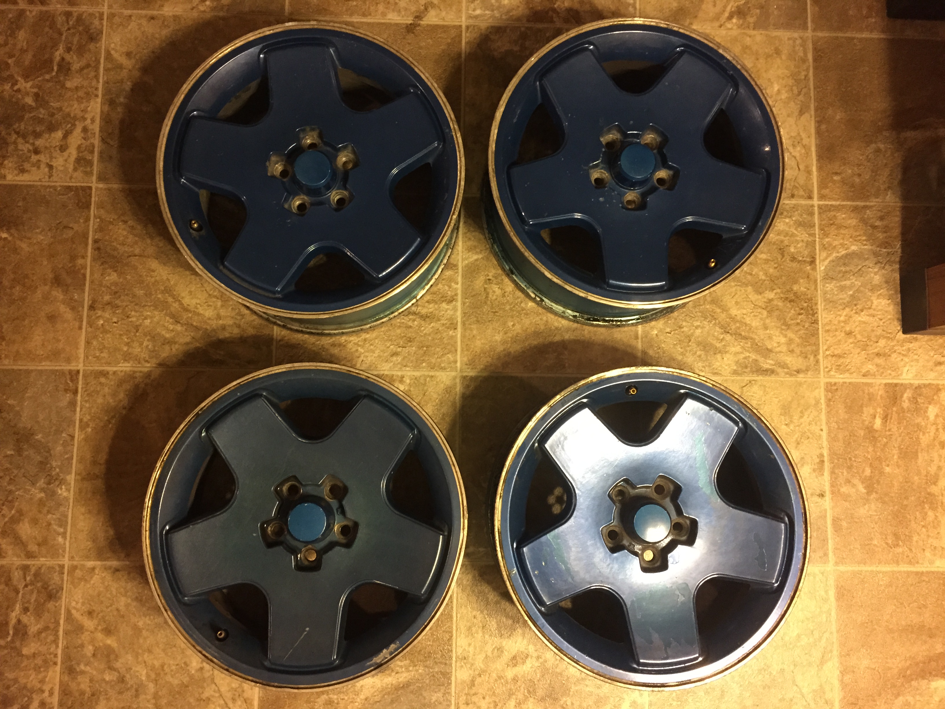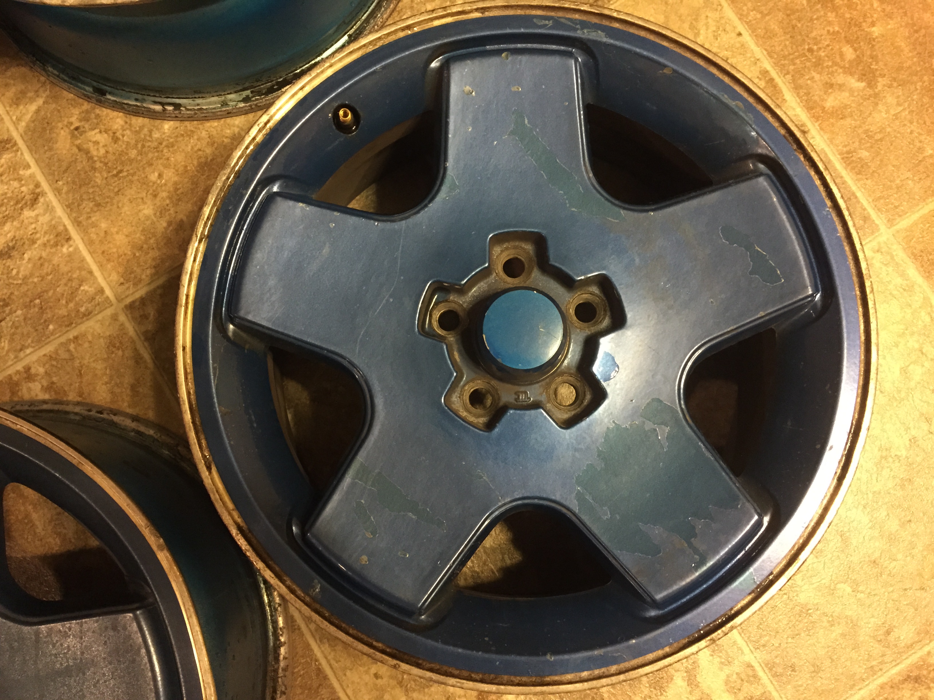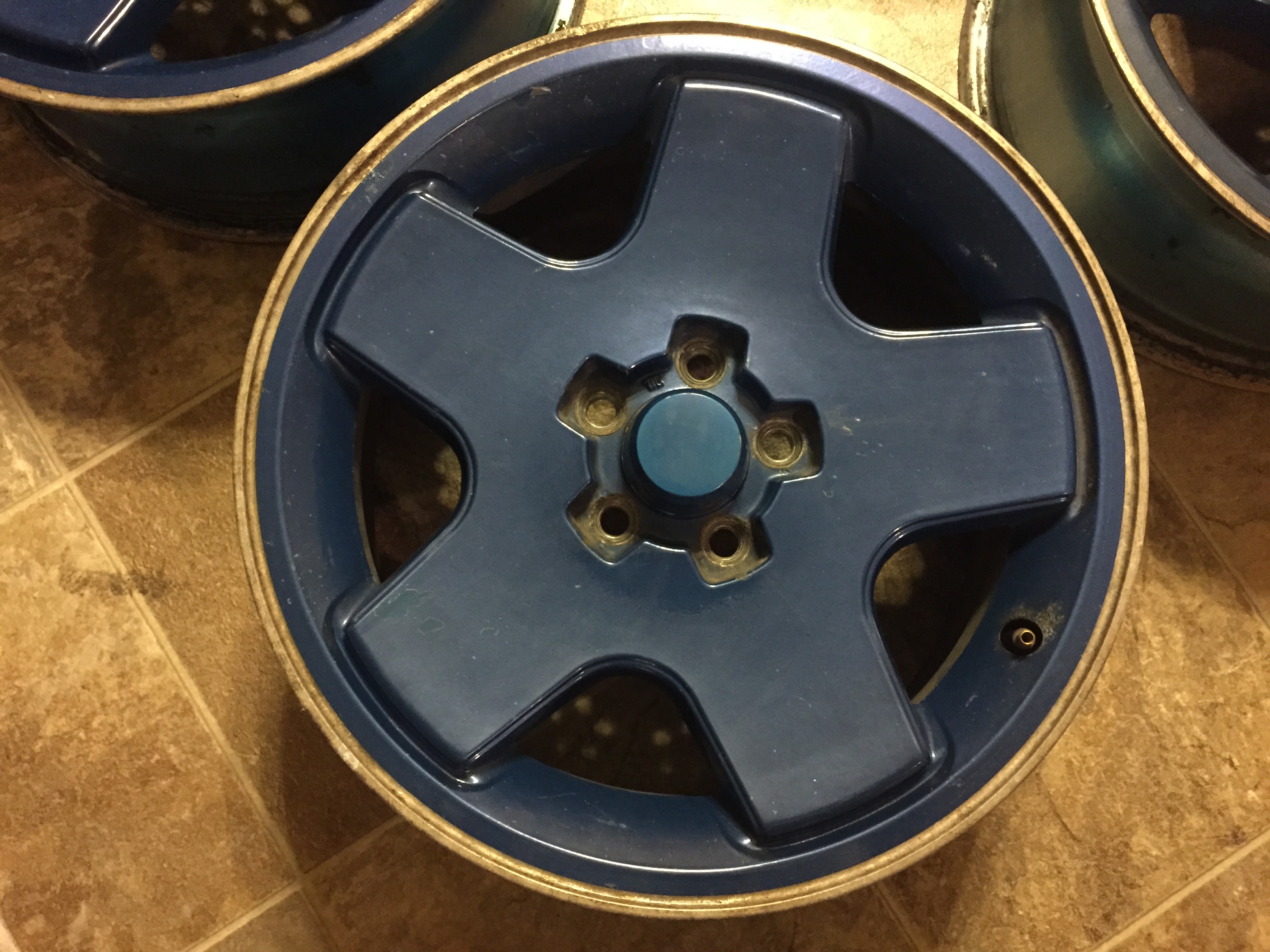 $100 located in Manitowoc, WI. This set of GTZ rims come with good condition center caps, and have very very little curb marks on them. I would rate them a 7.5 out of 10 as they do have some clear coat flake and one of them seems darker than the others. These would be a great platform to refinish or change color on!