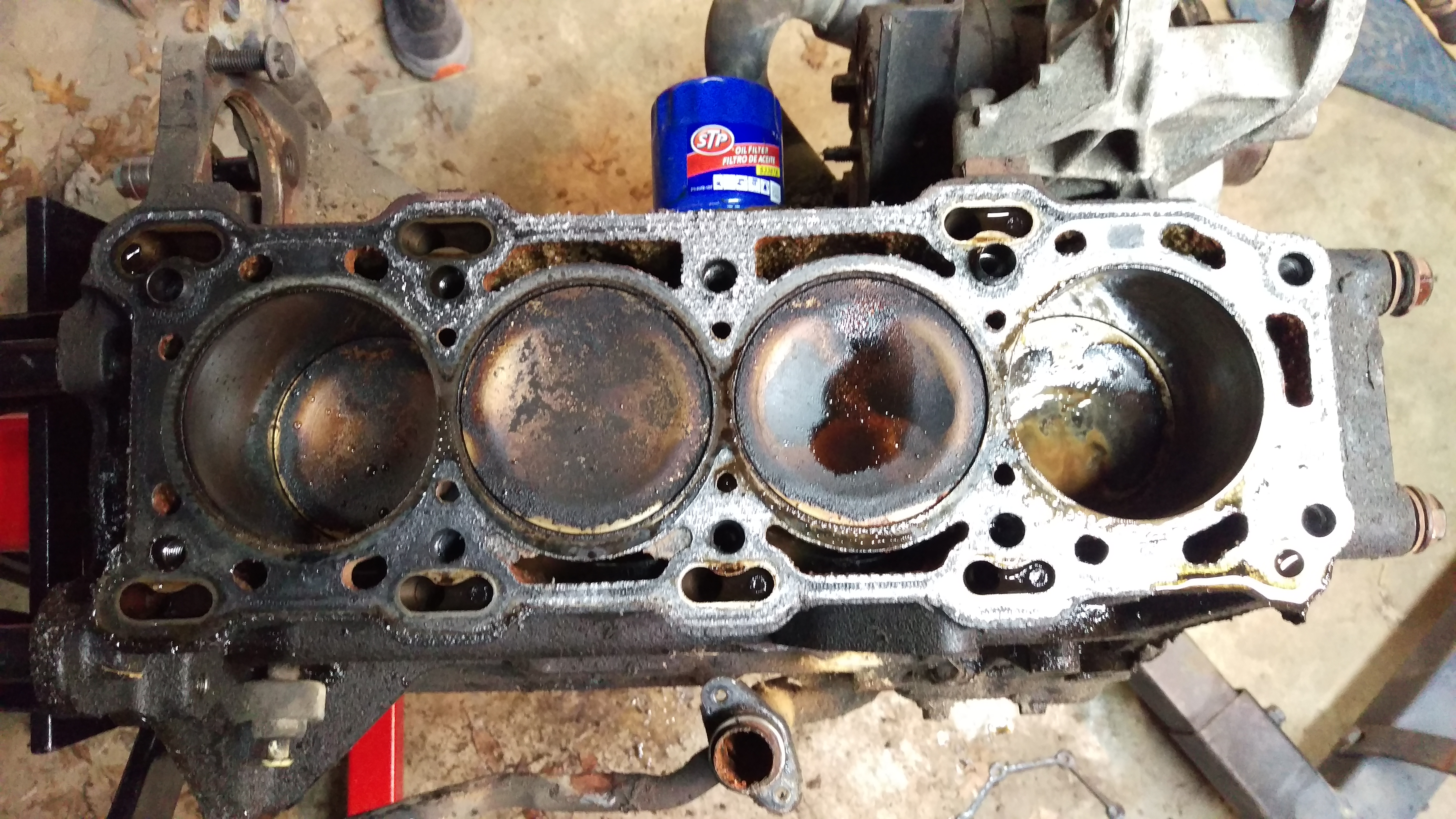 Tore the motor down tonight. Goods and bads. Timing housing was broken at the bottom. Most the water jackets were clogged. But everything else in great shape. Test fit the 2.4 head. Looks like only major difference other than chamber size and valves is the slot for the head bolts. 2.3 bolts barely dont fit.