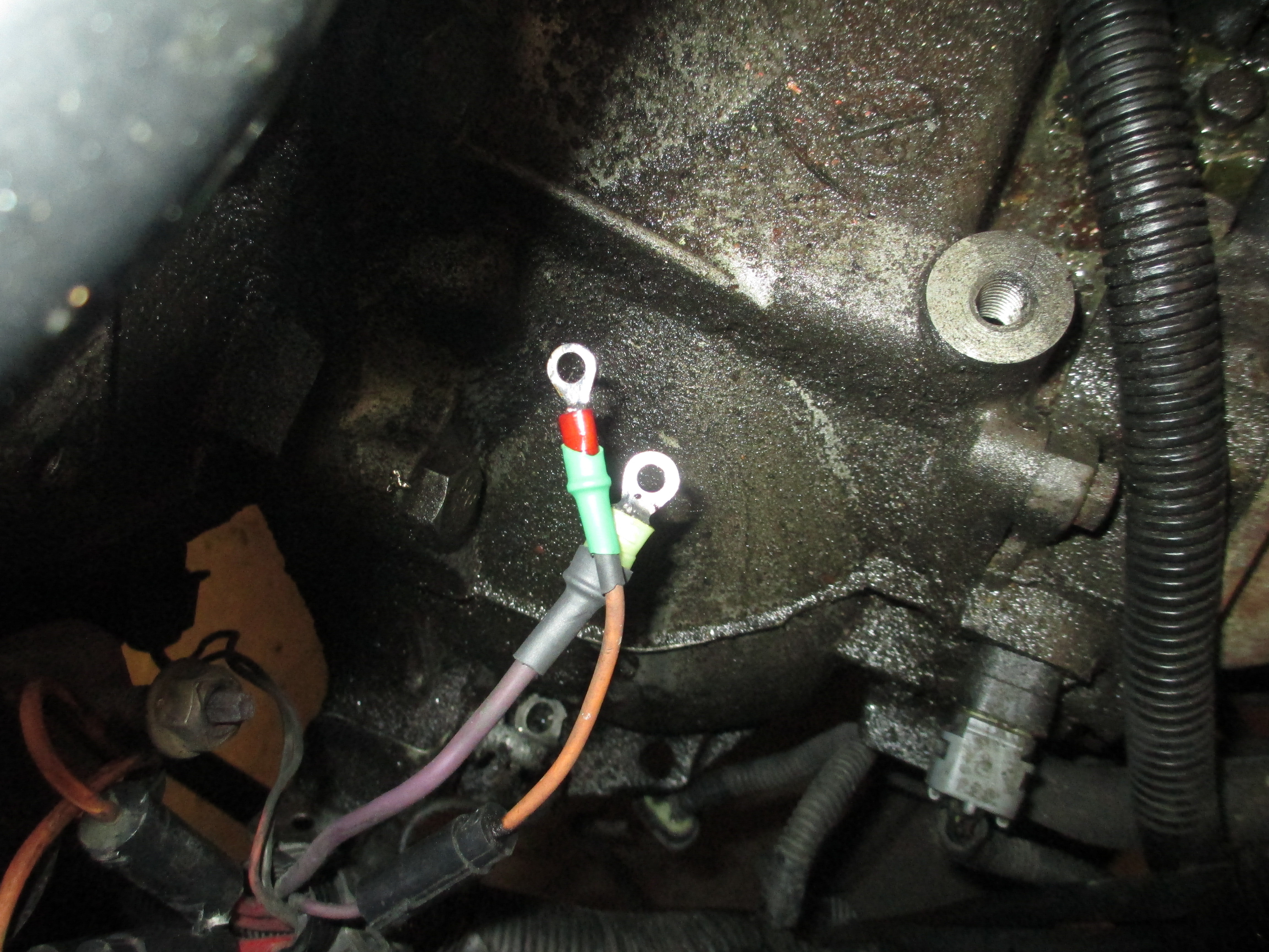 Next was grounding. The main cable goes to a stud on the trans, and then another cable, 4 ga or so, goes in to the split loom and then grounds to the body under the batt tray. I took this cable all the way out, sanded the frame rail to bare metal, added a couple stars washers. On the end where it mounts to the trans it is missing like 3" of insulation, but there's only one broken strand and it ohms out 0.1 ohm.