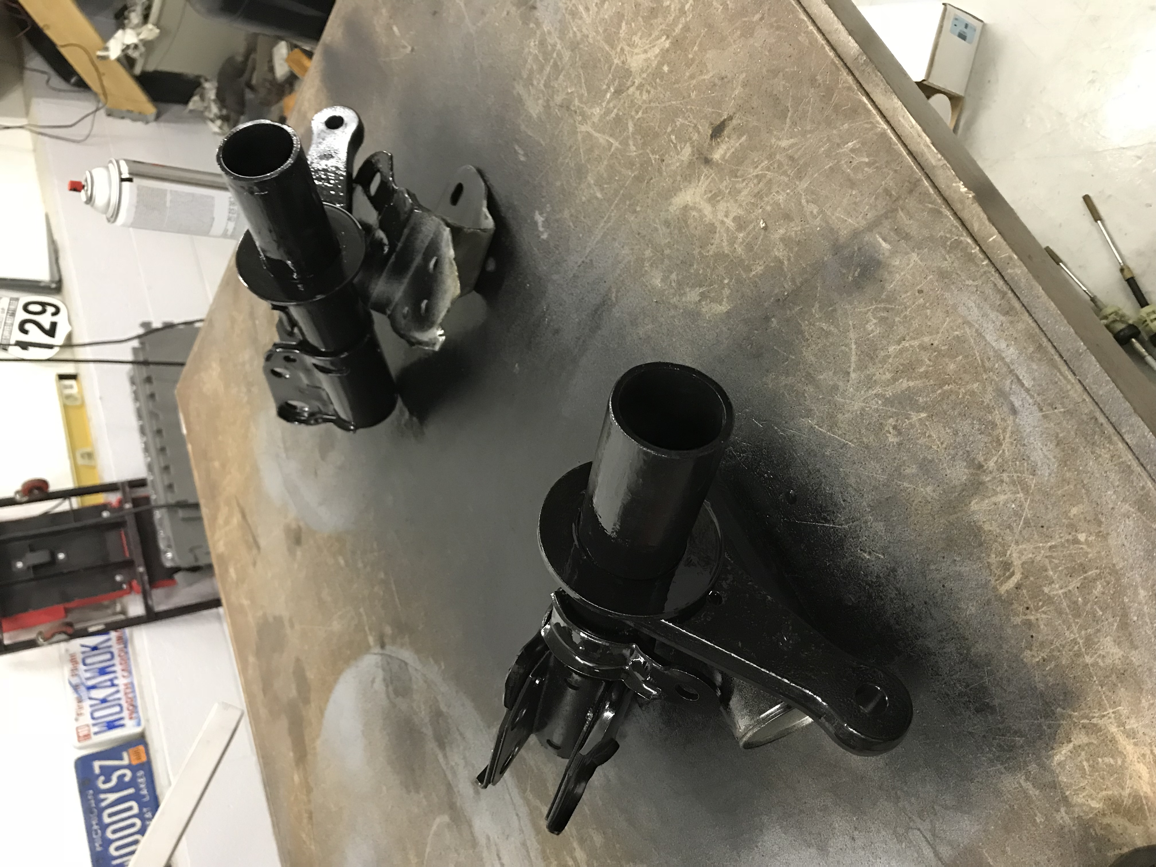 Finished modifying the struts; still need to weld the base of the coil over sleeve support (aka the washer) and weld the adapter sleeves to the top of the strut tube, and paint them, but here they are assembled.