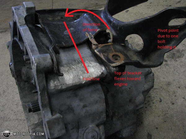 This is my intepretation of whats trying to happen... the line in the middle is where I'm saying that bracket is trying to fold in half and why they had the bracket continue to the block bolts, its not really "holding it up" its preventing the other bolted bracket from trying to flex toward the motor due to the main bracket being only one center bolt, a perfect pivot point... If it were two bolts at the frame mount I think this would have never been an issue since it wouldn't try to sag and flex as much. The fact that there is a big part missing between the original bracket and the top hole is why that bracket is flexing so much and caused one of the other bolts to crack the case. What you did may help but I'm not sure if its the fix all.