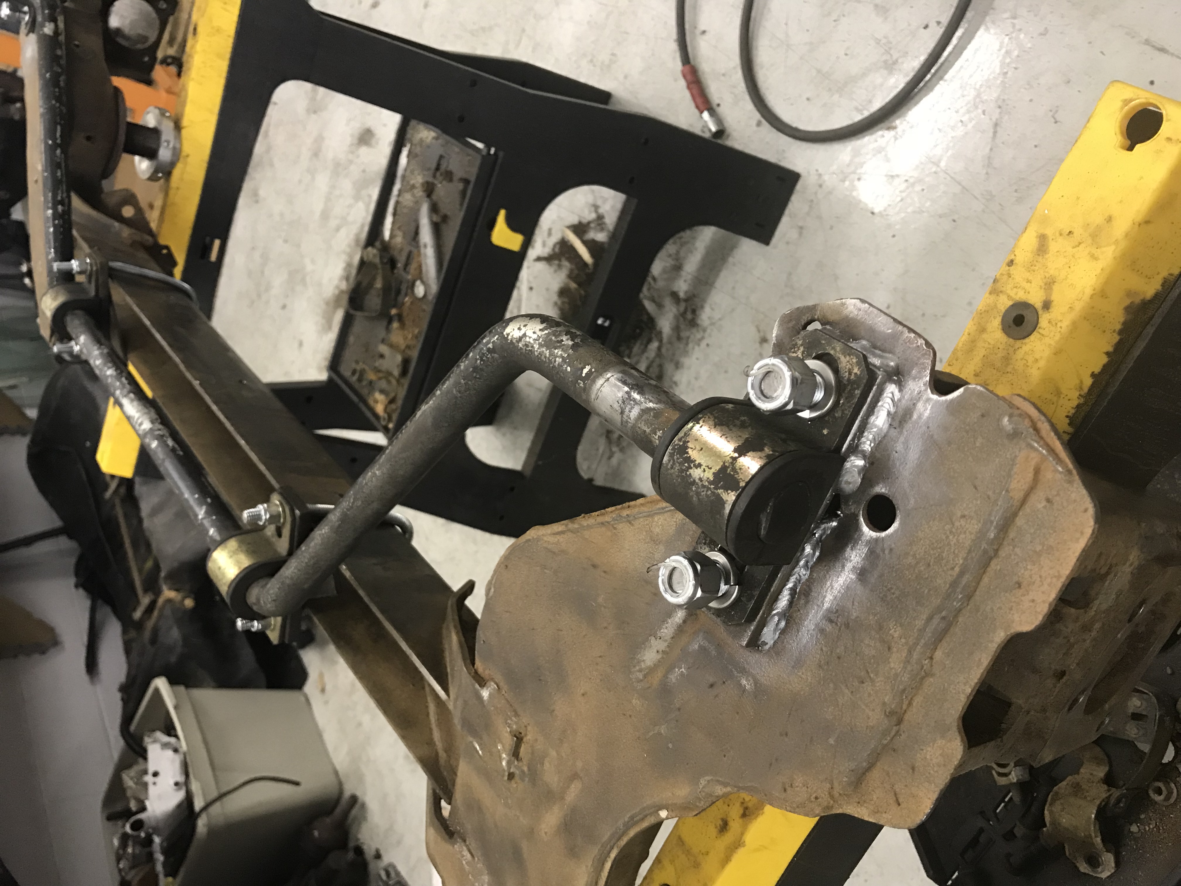 Shane and Brian really did most if not all the work on the axle. They stripped it down (I bought it loaded with everything on it still), cleaned it up some, got the bushings burned out and removed the steel from the bushing. Later, Brian positioned and welded in the Wolfe Racing adjustable coilover spring mounts, then we looked at how to mount the 26mm Addco bar to the axle. The "beam" section on the J-body axle is narrower than the L-body axle, so the Addco mounting hardware wouldn't swap over. A trip to Lowes solved that with some 3/8" all-thread for the center mounts over the beam. We reused, but modified, the Addco hardware from my old setup. For the ends of the bar, we again reused the old hardware, but tapped, threaded, and welded in studs for the bar to mount to. Then Brian welded them into place after careful measurement.