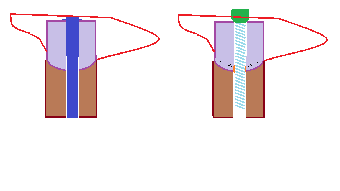 My thought is that the 'trunnion' may be pivoting with the slight side-force applied by the pushrod, which could cause impact noise against the stub, plus whatever vibrational noise as the bottom of the trunnion grinds along the top saddle of the pedestal base, and would change effective distance between lifter and rocker arm. Not much, and I really don't see how it could cause an audible noise without visible damage to the threads of the stud, but valvetrain is a finicky thing. The gap (orange) between VW stud and trunnion (purple) could cause movement. The OE bolt would prevent this movement.Rettax3 wrote:Is it possible that the studs are flexing under the loads? What about the top section of the rocker, ["trunnion"], could it be pivoting at the top and sliding back and forth on the top of the pedestal? The elongated flare on the shoulder of the stock bolts would also prevent that action, so maybe another reason they were designed that way...