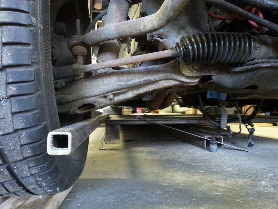 Centered fromt wheels in front Welding table by extending some antennas ......and cut out some access holes to get ready to weld body rails to rear sub....... both parts are centered and sitting level...... I have been using the trammel gauge and the wheel base is set to 103.5" and have been checking diagonal points and found that frame is within 1/4" of square......so good enough to move forward and weld soon......