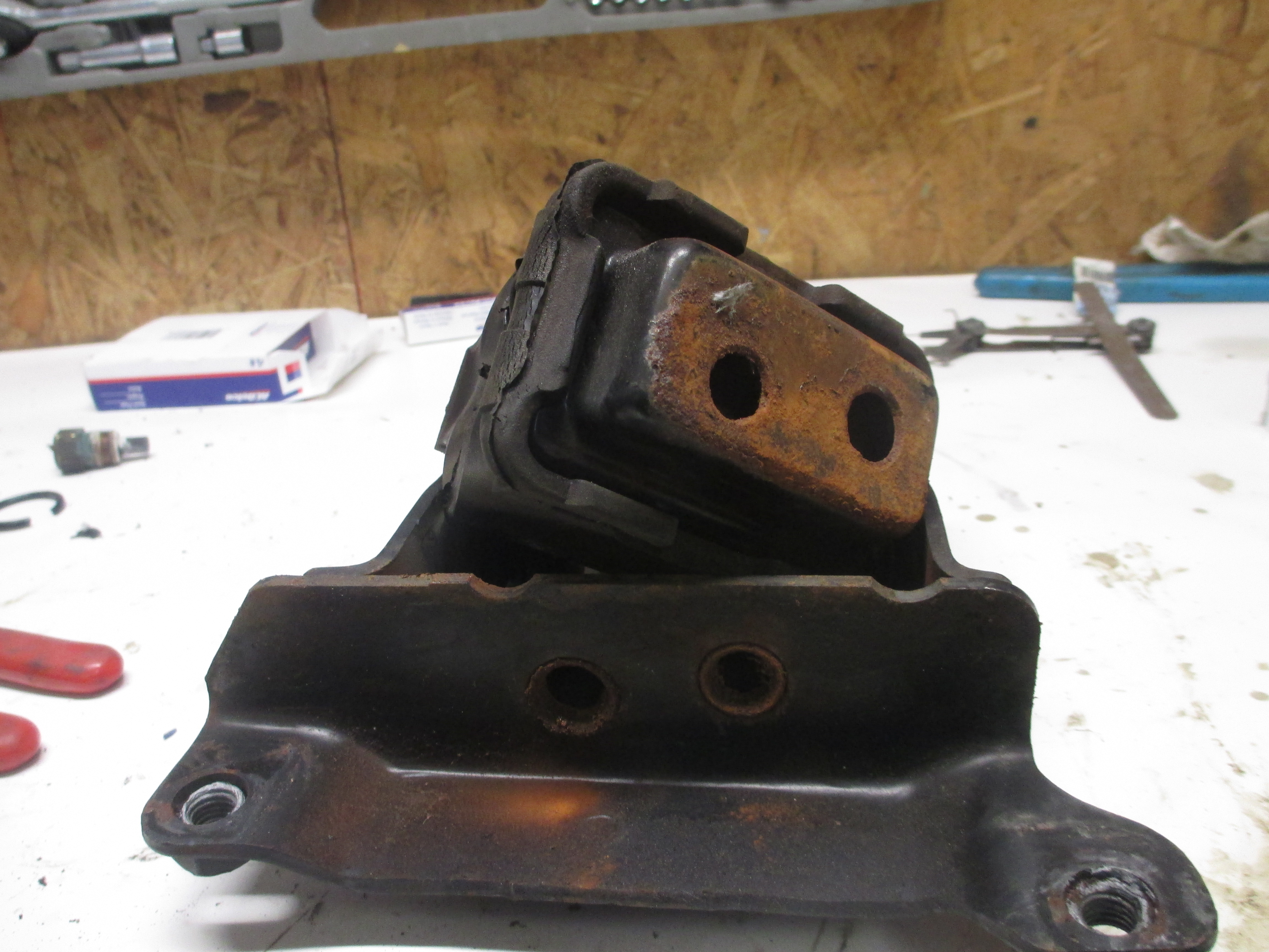 Still couldn't get it, but I found this, and this mount may be so sagged that it was making it harder to get to the tensioner. I do some research and find out that the mount is supposed to be swaged in to the housing! That explains all the orange rust dust, this thing was moving all over. It also explains the shuddering when I would let off the gas, and some random weird sounds when turning in to a parking spot..