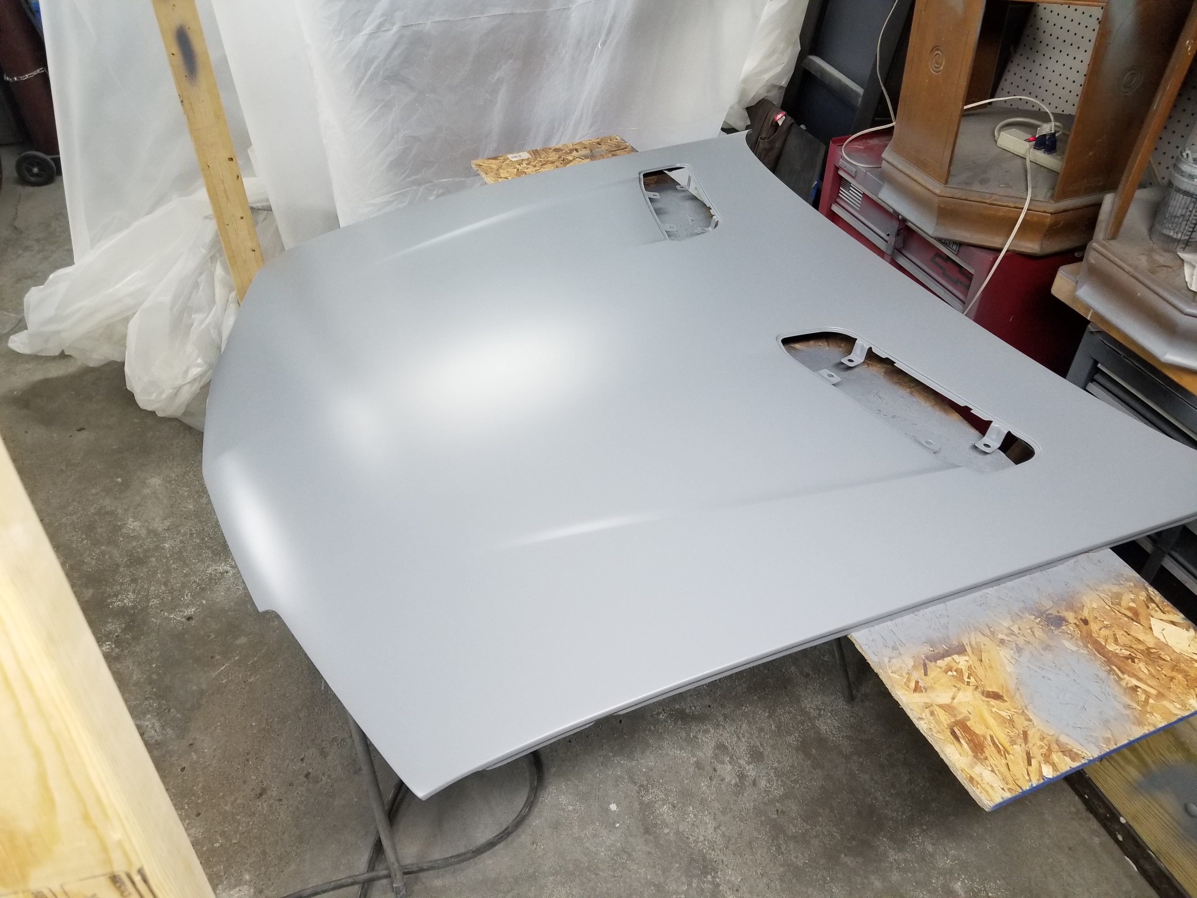 Hood progress coming along nicely. Body work done, all blocked out and reprimed.