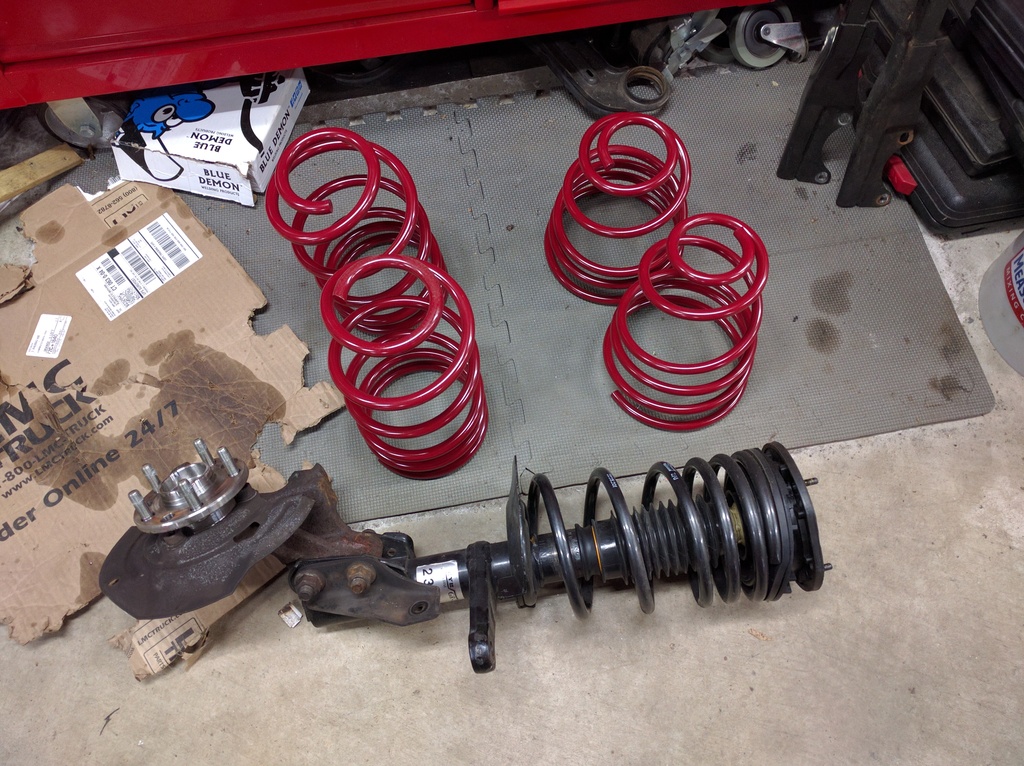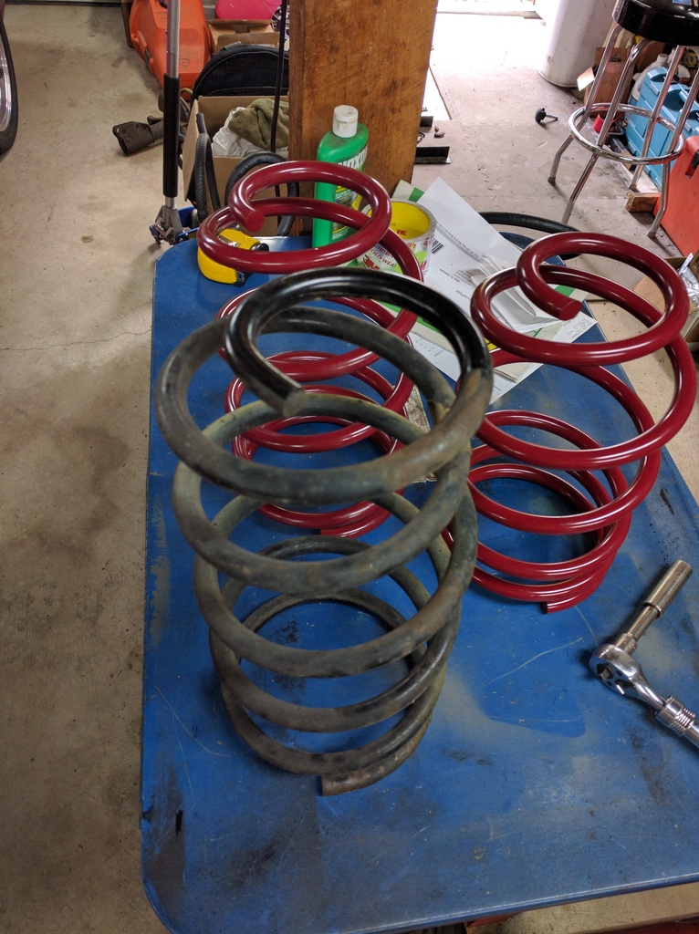 Also pulled apart struts to inspect tophats and try Canuck springs. The insulators have been sitting on top of Eibach springs for too long and have somewhat conformed to them so when attempting to fit the Canuck springs things didn't go smoothly and I didn't like how the spacer was fitting and the end angle of the upper mount when it was all assembled... It's going to take some more time and thought to get it to be right since looking at the Eibach vs the FE7 and Canuck spring the last top coil ends in a different spot... The 90's upper mount is designed to compensate for that, where the 95+ upper mount has a spacer to do the same but they are not equal. Maybe not right before Bfest I'll re-hash those out and see how the car sits. I also did a fat ass standing on the rear spring test and I can barely compress a FE7 rear... but I can really compress a Canuck rear. That was another thing that steered me away from swapping. I may check that against the Eibach as well to see which one seems stiffer... Right now its FE7 over the Canuck, I'm wondering where the Eibach will land.