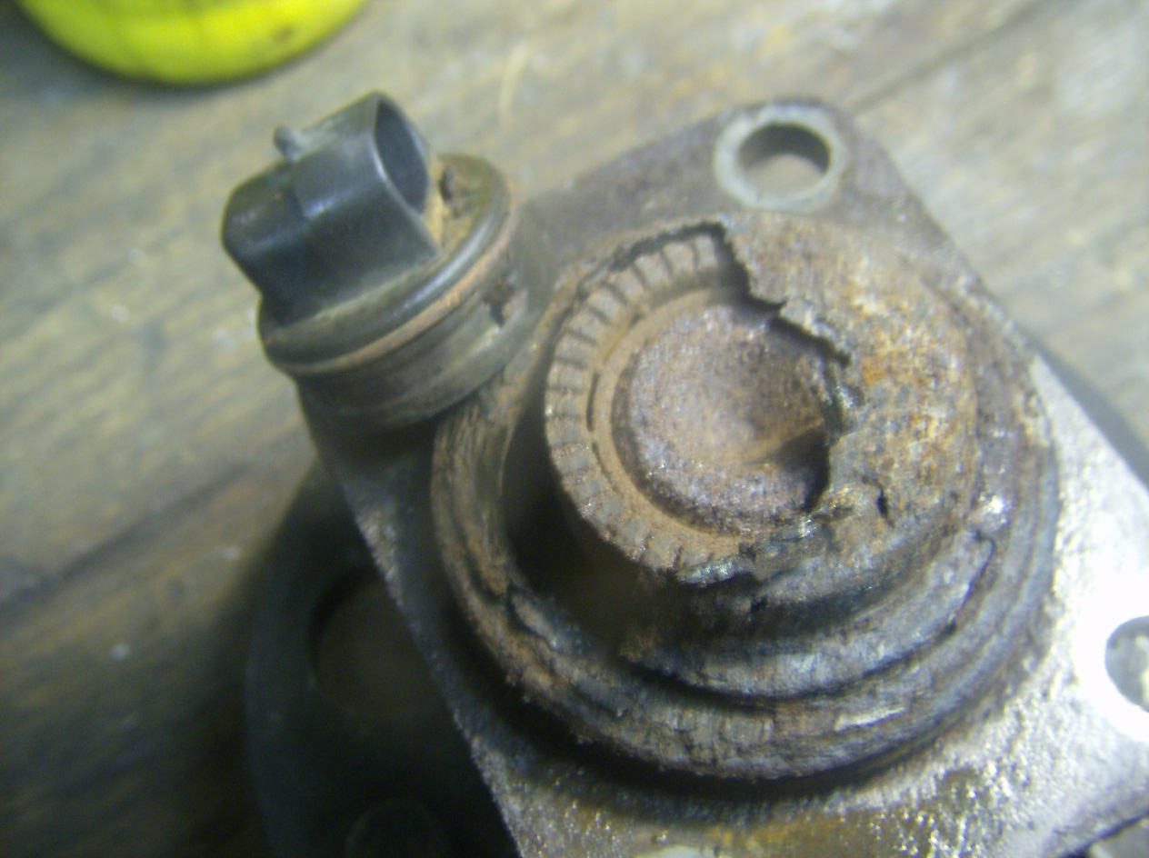 over 150k on the originals. All has been well until my ABS started acting up. I inspected and found the brakes getting rusty on the inside of the rotors so I did a complete brake job, new everything. A couple weeks later, I notice a rumbling sound at certain speeds. It would start at 35 mph then fade and get stronger at 55 mph. It seemed to be coming more from the driver's side. So since the brakes were the last thing done, I thought it was something to do with that. We had driven on a road with fresh gravel and the rumbling started just after that. I read that the dust could foul up the pads and so I cleaned them and the rotors as well. It didn't help. I emailed the store where I bought the pads and asked if they had any other complaints. No was the answer but they were nice enough to give me new pads in exchange. The new pads didn't help. So I wondered about my new rotors. I swapped an old turned rotor for the newer one and it didn't help either. So I finally decided to try changing out the new hubs I put on two years and 12k miles ago. I first changed the drivers side and no more grumbling was heard. So I changed the other side as well as a precaution. The noise is gone but I still have trouble with the ABS which I will continue to sort out. But I wondered what the heck happened to the hubs so I knocked them apart. Here is a picture of the bearing race that has chunks missing. I have no idea what the heck caused this. They had plenty of grease left in them. The other one looked fine. I wonder could the gravel dust have gotten in and fouled them up or were they just cheap Chinese junk that won't last? Any ideas?